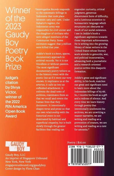 WINNER of the 2025 Lammy Awards for Bisexual Poetry "Interrogation Records is not only an important piece of historical research but also a display of significant poetic talent." --Electric Literature, "15 New and Forthcoming Collections You Should Be Reading" The winner of the 2023 Gaudy Boy Poetry Book Prize, selected by Divya Victor. Breaking the silence and collective amnesia around the Indonesian mass killings of 1965. To this day, there exists a black hole of silence in Indonesia's socio-political climate in acknowledging the 1965 Indonesian mass killings as what they were-tragedy.…mehr