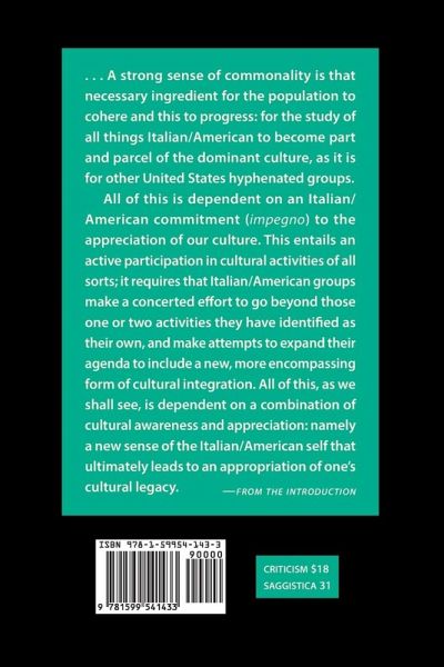 . . . A strong sense of commonality is that necessary ingredient for the population to cohere and this to progress: for the study of all things Italian/American to become part and parcel of the dominant culture, as it is for other United States hyphenated groups. All of this is dependent on an Italian/American commitment (impegno) to the appreciation of our culture. This entails an active participation in cultural activities of all sorts; it requires that Italian/American groups make a concerted effort to go beyond those one or two activities they have identified as their own, and make attempts to expand their agenda to include a new, more encompassing form of cultural integration. All of this, as we shall see, is dependent on a combination of cultural awareness and appreciation: namely a new sense of the Italian/American self that ultimately leads to an appropriation of one’s cultural legacy. —From the introduction