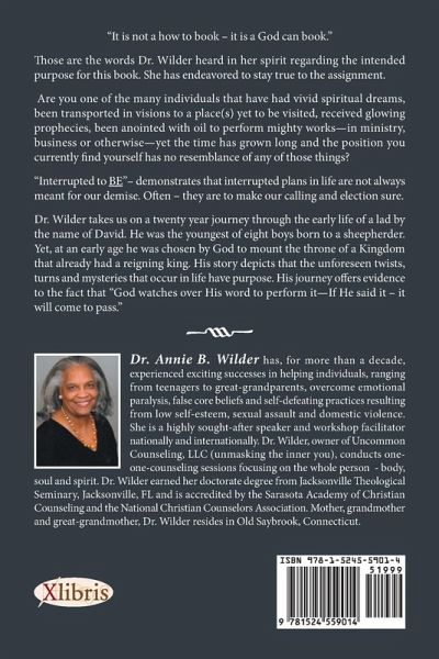 It is not a "how to book"-"it is a God can book." Those are the words Dr. Wilder heard in her spirit regarding the intended purpose for this book. She has endeavored to stay true to the assignment. Are you one of the many individuals that have had vivid spiritual dreams, been transported in visions to a place(s) yet to be visited, received glowing prophecies, been anointed with oil to perform mighty works-in ministry, business or otherwise-yet the time has grown long and the position you currently find yourself has no resemblance of any of those things? "Interrupted to Be" - demonstrates that interrupted plans in life are not always meant for our demise. Often - they are to make our calling and election sure. Dr. Wilder takes us on a twenty year journey through the early life of a lad by the name of David. He was the youngest of eight boys born to a sheepherder. Yet, at an early age he was chosen by God to mount the throne of a Kingdom that already had a reigning king. His story depicts that the unforeseen twists, turns and mysteries that occur in life have purpose. His journey offers evidence to the fact that "God watches over His word to perform it-If He said it - it will come to pass."