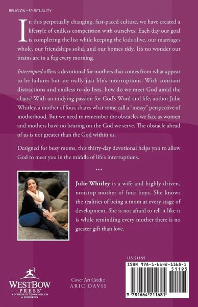 In this perpetually changing, fast-paced culture, we have created a lifestyle of endless competition with ourselves. Each day our goal is completing the list while keeping the kids alive, our marriages whole, our friendships solid, and our homes tidy. It's no wonder our brains are in a fog every morning. Interrupted offers a devotional for mothers that comes from what appear to be failures but are really just life's interruptions. With constant distractions and endless to-do lists, how do we meet God amid the chaos? With an undying passion for God's Word and life, author Julie Whitley, a mother of four, shares what some call a "messy" perspective of motherhood. But we need to remember the obstacles we face as women and mothers have no bearing on the God we serve. The obstacle ahead of us is not greater than the God within us. Designed for busy moms, this thirty-day devotional helps you to allow God to meet you in the middle of life's interruptions.