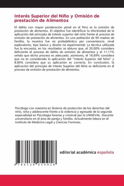 El delito con mayor ponderación penal en el Perú es la omisión de prestación de alimentos. El objetivo fue identificar la efectividad de la aplicación del principio de interés superior del niño frente al proceso de omisión de prestación de alimentos. En una población de 90 madres de familia, la muestra fue no probabilístico por conveniencia. nivel exploratorio, tipo básico y diseño no experimental; La técnica utilizada fue la encuesta; en los resultados se obtuvo que, el 20.00% considera deficiente el proceso de delito de omisión de alimentos y el 11.11% señala que dicho proceso es adecuado; asimismo, el 18.89% considera que no es considerado la aplicación del "Interés Superior del Niño" y 8.89% considera que su aplicación es correcta. En conclusión, la aplicación del principio de Interés Superior del Niño es deficiente en el proceso de omisión de prestación de alimentos.