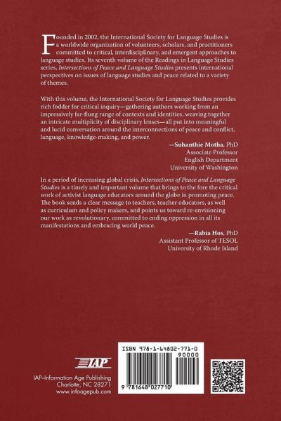 Readings in Language Studies, Volume 7: Intersections of Peace and Language Studies features international contributions that represent state-of-the-field reviews, multi-disciplinary perspectives, theory-driven syntheses of current scholarship, reports of new empirical research, reflections on pedagogical practices, and critical discussions of major topics centered on the intersection of language studies and peace. Consistent with the mission of ISLS, the collection of 13 chapters in this volume seeks to "bridge these arbitrary disciplinary territories and provide a forum for both theoretical and empirical research, from existing and emergent research methodologies, for exploring the relationships among language, power, discourses, and social practices." Language and peace are in themselves incredibly complex concepts. They are simultaneously interpersonal in their function and effect as well as intimately personal in their experience. From everyday communication to the pragmatics of world diplomacy, from embracing a foreign culture to embarking upon a journey of self-awareness, language and peace are inseparably intertwined. To reveal their myriad interconnections, in local and global contexts, is a limitless task; nevertheless, we attempt to bring you a few glimpses from far corners of the world. It is also a linguistic and postcolonial mission of this society and the book series to publish the voices of non-native speakers of English. Decolonizing the academic enterprise is part of our commitment to diversity.