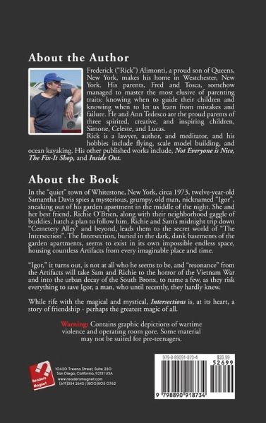 In the "quiet" town of Whitestone, New York, circa 1973, twelve-year-old Samantha Davis spies a mysterious, grumpy, old man, nicknamed "Igor", sneaking out of his garden apartment in the middle of the night. She and her best friend, Richie O'Brien, along with their neighborhood gaggle of buddies, hatch a plan to follow him. Richie and Sam's midnight trip down "Cemetery Alley" and beyond, leads them to the secret world of "The Intersection". The Intersection, buried in the dark, dank basements of the garden apartments, seems to exist in its own impossible endless space, housing countless Artifacts from every imaginable place and time. "Igor," it turns out, is not at all who he seems to be, and "resonance" from the Artifacts will take Sam and Richie to the horror of the Vietnam War and into the urban decay of the South Bronx, to name a few, as they risk everything to save Igor, a man, who until recently, they hardly knew. While rife with the magical and mystical, Intersections is, at its heart, a story of friendship - perhaps the greatest magic of all. Warning: Contains graphic depictions of wartime violence and operating room gore. Some material may not be suited for pre-teenagers.