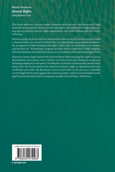 Moreover, binary legal frameworks prevent them from enjoying the rights to access identification documents, start a family, or be free from discrimination in all areas including employment and sports. To elaborate on intersex violations that emanate from binary laws, this book examines the situation of intersex rights in regional jurisdictions worldwide and within the European Union in particular. In the process, it identifies current legal barriers and suggests how intersex people could be accommodated under legal frameworks and achieve sex/gender equality beyond binary definitions.