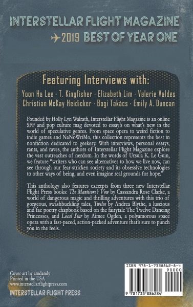 From space opera to weird fiction to indie games and NaNoWriMo, this collection represents the best in nonfiction dedicated to geekery. Founded by Holly Lyn Walrath, Interstellar Flight Magazine is an online SFF and pop culture mag devoted to essays on what's new in the world of speculative genres. With interviews, personal essays, rants, and raves, the authors of Interstellar Flight Magazine explore the vast outreaches of nerdom. In the words of Ursula K. Le Guin, we feature "writers who can see alternatives to how we live now, can see through our fear-stricken society and its obsessive technologies to other ways of being, and even imagine real grounds for hope." This anthology also features excerpts from three new Interstellar Flight Press books: The Manticore's Vow by Cassandra Rose Clarke, a world of dangerous magic and thrilling adventures with this trio of gorgeous, swashbuckling tales, Twelve by Andrea Blythe, a luscious and fae poetry chapbook based on the fairytale The Twelve Dancing Princesses, and Local Star by Aimee Ogden, a polyamorous space opera with a fast-paced, action-packed adventure that's sure to punch you in the feels. Featuring interviews with T. Kingfisher, Bogi Takács, Valerie Valdes, R.F. Kuang, Christian McKay Heidicker, Elizabeth Lim, Emily A. Duncan, and Yoon Ha Lee. Contributors: E.D. Walker, Jeremy Brett, T.D. Walker, Archita Mittra, Piper J. Daniels, John Tuttle, J.T. Morse, Presley Thomas, Caitlin Starling, Erin Becker, Michael Glazner, Kaylee Craig, Cassandra Rose Clarke, Andrea Blythe, Aimee Ogden.