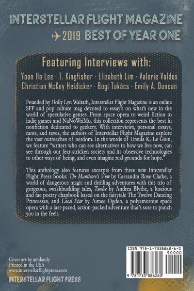 From space opera to weird fiction to indie games and NaNoWriMo, this collection represents the best in nonfiction dedicated to geekery. Founded by Holly Lyn Walrath, Interstellar Flight Magazine is an online SFF and pop culture mag devoted to essays on what's new in the world of speculative genres. With interviews, personal essays, rants, and raves, the authors of Interstellar Flight Magazine explore the vast outreaches of nerdom. In the words of Ursula K. Le Guin, we feature "writers who can see alternatives to how we live now, can see through our fear-stricken society and its obsessive technologies to other ways of being, and even imagine real grounds for hope." This anthology also features excerpts from three new Interstellar Flight Press books: The Manticore's Vow by Cassandra Rose Clarke, a world of dangerous magic and thrilling adventures with this trio of gorgeous, swashbuckling tales, Twelve by Andrea Blythe, a luscious and fae poetry chapbook based on the fairytale The Twelve Dancing Princesses, and Local Star by Aimee Ogden, a polyamorous space opera with a fast-paced, action-packed adventure that's sure to punch you in the feels. Featuring interviews with T. Kingfisher, Bogi Takács, Valerie Valdes, R.F. Kuang, Christian McKay Heidicker, Elizabeth Lim, Emily A. Duncan, and Yoon Ha Lee. Contributors: E.D. Walker, Jeremy Brett, T.D. Walker, Archita Mittra, Piper J. Daniels, John Tuttle, J.T. Morse, Presley Thomas, Caitlin Starling, Erin Becker, Michael Glazner, Kaylee Craig, Cassandra Rose Clarke, Andrea Blythe, Aimee Ogden.