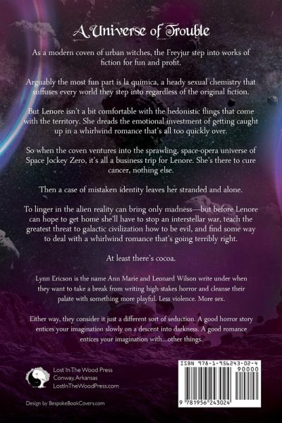 As a modern coven of urban witches, the Freyjur step into works of fiction for fun and profit. Arguably the most fun part is la química, a heady sexual chemistry that suffuses every world they step into regardless of the original fiction. But Lenore isn't a bit comfortable with the hedonistic flings that come with the territory. She dreads the emotional investment of getting caught up in a whirlwind romance that's all too quickly over. So when the coven ventures into the sprawling, space-opera universe of Space Jockey Zero, it's all a business trip for Lenore. She's there to cure cancer, nothing else. Then a case of mistaken identity leaves her stranded and alone. To linger in the alien reality can bring only madness-but before Lenore can hope to get home she'll have to stop an interstellar war, teach the greatest threat to galactic civilization how to be evil, and find some way to deal with a whirlwind romance that's going terribly right. At least there's cocoa.