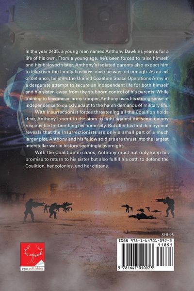 In the year 2435, a young man named Anthony Dawkins yearns for a life of his own. From a young age, he's been forced to raise himself and his beloved sister. Anthony's isolated parents also expect him to take over the family business once he was old enough. As an act of defiance, he joins the Unified Coalition Space Operations Army in a desperate attempt to secure an independent life for both himself and his sister, away from the stubborn control of his parents. While training to become an army trooper, Anthony uses his strong sense of independence to quickly adapt to the harsh demands of military life. With Insurrectionist forces threatening all the Coalition holds dear, Anthony is sent to the stars to fight against the same enemy responsible for bombing his home city. But after his first deployment reveals that the Insurrectionists are only a small part of a much larger plot, Anthony and his fellow soldiers are thrust into the largest interstellar war in history seemingly overnight. With the Coalition in chaos, Anthony must not only keep his promise to return to his sister but also fulfill his oath to defend the Coalition, her colonies, and her citizens.