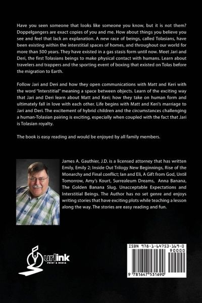 Have you seen someone that looks like someone you know, but it is not them? Doppelgangers are exact copies of you and me. How about things you believe you see and feel that lack an explanation. A new race of beings, called Tolasians, have been existing within the interstitial spaces of homes, and throughout our world for more than 500 years. They have existed in a gas stasis form until now. Meet Jari and Deri, the first Tolasians beings to make physical contact with humans. Learn about travelers and trappers and the sporting event of boxing that existed on Tolas before the migration to Earth. Follow Jari and Deri and how they open communications with Matt and Keri with the word "Interstitial" meaning a space between objects. Learn of the exciting way that Jari and Deri learn about Matt and Keri; how they take on human form and ultimately fall in love with each other. Life begins with Matt and Keri’s marriage to Jari and Deri. The excitement of hybrid children and the circumstances challenging a human-Tolasian pairing is exciting, especially when coupled with the fact that Jari is Tolasian royalty. The book is easy reading and would be enjoyed by all family members.