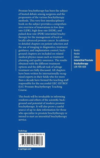 Prostate brachytherapy has been the subject of heated debate among surgeons and the proponents of the various brachytherapy methods. This very first interdisciplinary book on the subject provides a comprehensive overview of innovations in low dose rate (LDR), high dose rate (HDR), and pulsed dose rate (PDR) interstitial brachytherapy for the management of local or locally advanced prostate cancer. In addition to detailed chapters on patient selection and the use of imaging in diagnostics, treatment guidance, and implantation control, background chapters are included on related medical physics issues such as treatment planning and quality assurance. The results obtained with the different treatment options and the difficult task of salvage treatment are fully discussed. All chapters have been written by internationally recognized experts who for more than a decade have formed the teaching staff responsible for the successful GEC-ESTRO/EAU Prostate Brachytherapy Teaching Course.