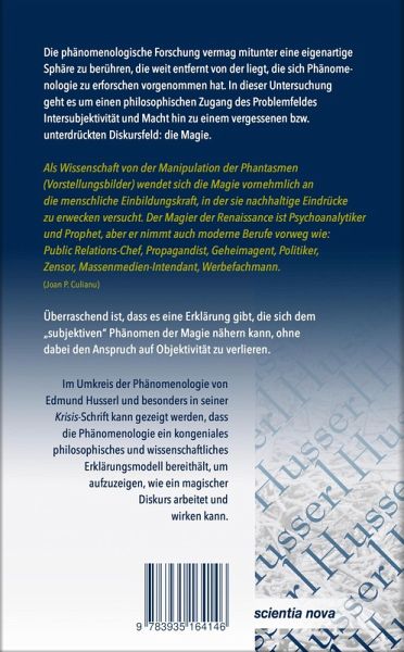 Die phänomenologische Forschung vermag mitunter eine eigenartige Sphäre zu berühren, die weit entfernt von der liegt, die sich Phänomenologie zu erforschen vorgenommen hat. In dieser Untersuchung geht es um einen philosophischen Zugang des Problemfeldes Intersubjektivität und Macht hin auf ein vergessenes bzw. unterdrücktes Diskursfeld: die Magie. In dieser Untersuchung geht es darum, ein solches Epiphänomen des menschlichen Geistes, wie es Magie darstellt, objektiv betrachten zu können. Dabei erwies sich die Phänomenologie als guter und zielführender Ansatz, um vorurteilsfrei über das forschen zu können, was "es gibt". Denn um ein Wort Shakespeares leicht zu modifizieren: "Es gibt mehr Ding im Himmel und auf Erden, als unsere Schulweisheit sich träumt." Im Umkreis der Phänomenologie von Edmund Husserl und besonders seiner Schrift "Die Krisis der europäischen Wissenschaften und die transzendentale Phänomenologie" kann gezeigt werden, dass die Phänomenologie ein kongeniales philosophisches und wissenschaftliches Erklärungsmodell bereithält, um aufzuzeigen, wie ein magischer Diskurs arbeitet und wirken kann.