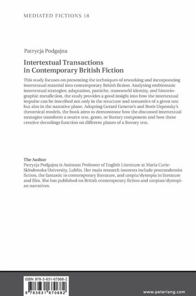 This study focuses on presenting the techniques of reworking and incorporating intertextual material into contemporary British fiction. Analysing emblematic intertextual strategies: adaptation, pastiche, transworld identity, and historiographic metafiction, the study provides a good insight into how the intertextual impulse can be inscribed not only in the structure and semantics of a given text but also in the narrative plane. Adopting Gerard Genette's and Boris Uspensky's theoretical models, the book aims to demonstrate how the discussed intertextual strategies transform a source text, genre, or literary component and how these creative decodings function on different planes of a literary text.