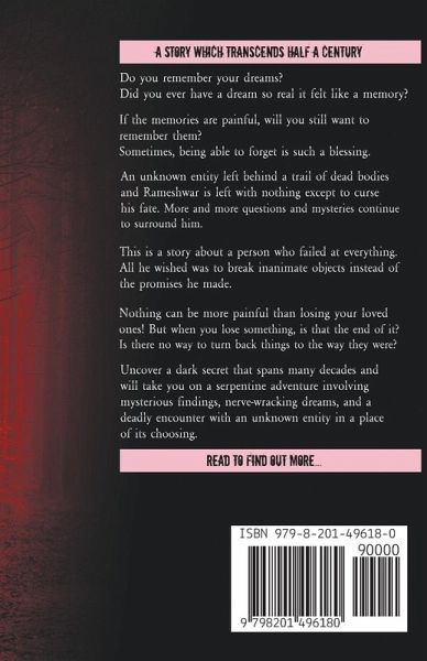Do you remember your dreams? Did you ever have a dream so real it felt like a memory? If the memories are painful, will you still want to remember them? Sometimes, being able to forget is such a blessing. An unknown entity left behind a trail of dead bodies and Rameshwar is left with nothing except to curse his fate. More and more questions and mysteries continue to surround him. This is a story about a person who failed at everything. All he wished was to break inanimate objects instead of the promises he made. Nothing can be more painful than losing your loved ones! But when you lose something, is that the end of it? Is there no way to turn back things to the way they were? Uncover a dark secret that spans many decades and will take you on a serpentine adventure involving mysterious findings, nerve-wracking dreams, and a deadly encounter with an unknown entity in a place of its choosing.