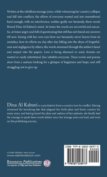 Written at the rebellious teenage years, while witnessing her country collapse and fall into conflicts, the efforts of everyone wasted and not remembered hard enough, with no interference, neither godly nor humanly, these words flowed Dina Al Kabani's mind. At times the words are sorrowful and sarcastic, at times angry and full of questioning that still has not found any answers till now. Seeing with her own eyes how our humanity never learns from its mistakes, how its efforts are day after day falling into the abyss of forgetfulness and negligence by others, the words streamed through the author's heart and seeped into the papers. Love is being shunned or used, dreams are wasted or easily substituted, fear inhabits everyone. These words and poems stem from a sadness looking for a glimpse of happiness and hope, and still struggling not to give up.