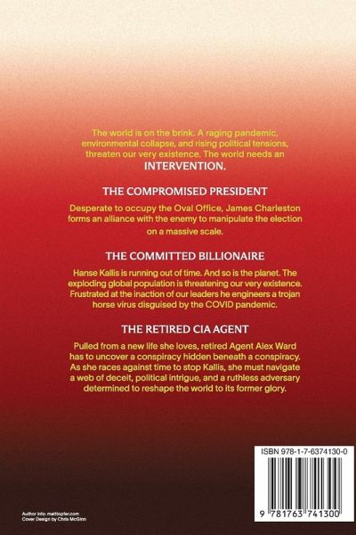 INTERVENTION: A POLITICAL ACTION THRILLER "BRILLIANT STORY-TELLING. IS THIS FICTION AS PREDICTION...?" The world is on the brink. A raging pandemic, environmental collapse, and rising political tensions threaten our very existence. The world needs an INTERVENTION. THE COMPROMISED PRESIDENT Desperate to occupy the Oval Office, James Charleston forms an alliance with the enemy to manipulate the election on a massive scale. THE COMMITTED BILLIONAIRE Hanse Kallis is running out of time. And so is the planet. The exploding global population is pressuring the way we live in every possible way. Frustrated at the inaction of our leaders he engineers a trojan horse virus disguised by the COVID pandemic. THE RETIRED CIA AGENT Pulled from a new life she loves, retired Agent Alex Ward has to uncover a conspiracy hidden beneath a conspiracy. As she races against time to stop Kallis, she must navigate a web of deceit, political intrigue, and a ruthless adversary determined to reshape the world to its former glory.