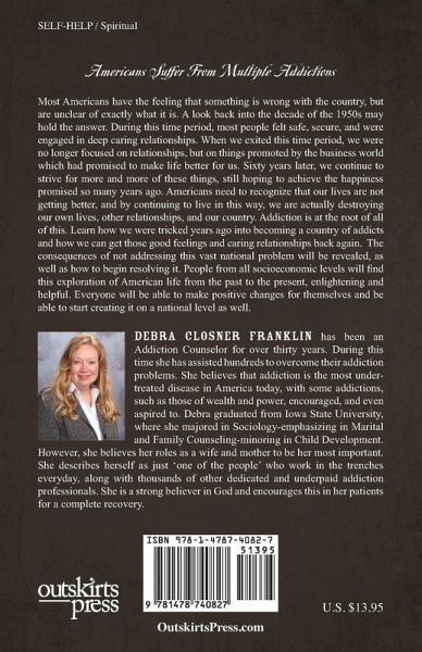 Americans Suffer From Multiple Addictions... Most Americans have the feeling that something is wrong with the country, but are unclear of exactly what it is. A look back into the decade of the 1950s may hold the answer. During this time period, most people felt safe, secure, and were engaged in deep caring relationships. When we exited this time period, we were no longer focused on relationships, but on things promoted by the business world which had promised to make life better for us. Sixty years later, we continue to strive for more and more of these things, still hoping to achieve the happiness promised so many years ago. Americans need to recognize that our lives are not getting better, and by continuing to live in this way, we are actually destroying our own lives, other relationships, and our country. Addiction is at the root of all of this. Learn how we were tricked years ago into becoming a country of addicts and how we can get those good feelings and caring relationships back again. The consequences of not addressing this vast national problem will be revealed, as well as how to begin resolving it. People from all socioeconomic levels will find this exploration of American life from the past to the present, enlightening and helpful. Everyone will be able to make positive changes for themselves and be able to start creating it on a national level as well.