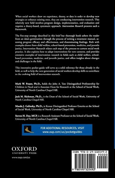 Intervention research lies at the heart of social work research. It serves as a principal basis for drawing inferences about the effectiveness of practice and is used to assess the design of public policies that fund social and health programs. This book, the latest volume in the Pocket Guides to Social Work Research Methods, clearly describes the process of conducting intervention research.