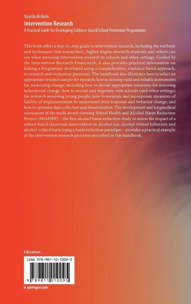 This book offers a step-by-step guide to intervention research, including the methods and techniques that researchers, higher degree research students and others can use when pursuing intervention research in schools and other settings. Guided by the Intervention Research Framework, it also provides practical information on linking a program developed using a comprehensive, evidence-based approach, to research and evaluation processes. The handbook also illustrates how to select an appropriate research sample for research; how to develop valid and reliable instruments for measuring change, including how to devise appropriate measures for assessing behavioural change; how to recruit and negotiate with schools (and other settings) for research involving young people; how to measure and incorporate measures of fidelity of implementation to understand dose response and behavior change; and how to optimize data collection and dissemination. The development and longitudinal assessment of themulti award-winning School Health and Alcohol Harm Reduction Project (SHAHRP) - the first alcohol harm reduction study to assess the impact of a school-based classroom intervention on alcohol use, alcohol-related behaviors and alcohol-related harm using a harm reduction paradigm - provides a practical example of the intervention research processes described in this handbook.