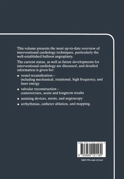 Current and future techniques in interventional cardiology and angiology.- Current and future techniques in interventional cardiology and angiology.- Additional aspects to balloon angioplasty.- Long wire technique for coronary angioplasty - the Frankfurt experience.- Advances in x-ray equipment - digital subtraction angiography with on-line quantification.- Myocardial release of lactate, hypoxanthine, and urate during and following percutaneous transluminal coronary angioplasty. Potential mechanism for the generation of free radicals.- Adenosine production during balloon-induced ischemia.- Can one predict reversibility of regional ventricular dysfunction?.- Current assessment of balloon valvuloplasty.- Quantitative and qualitative morphological changes during intraoperative balloon valvuloplasty.- What can we learn from classical operative techniques for valvular balloon dilatation?.- Percutaneous balloon valvuloplasty of aortic stenosis in 110 consecutive patients.- Balloon aortic valvuloplasty in adults: report of 78 consecutive patients.- Experience with mitral valvuloplasty.- Assessment of left ventricular function during aortic balloon valvuloplasty by transesophageal echocardiography.- New techniques for revascularization.- Percutaneous transluminal atherectomy of the peripheral and coronary arteries.- Histological findings from "atherectomy" specimens.- Cell culture of human atheromatous plaque material.- Low-speed rotational angioplasty - clinical results in 53 patients with chronic occlusions.- Laser angioplasty: 1988.- Intraoperative coronary laser angioplasty - first clinical experiences with a new method.- Laser angioplasty of iliac and femoropopliteal obstructive lesions.- Radiofrequency coronary angioplasty in patients with coronary arterydisease - a new method for treatment of coronary artery stenoses.- Angioscopy in the evaluation of interventional cardiovascular procedures.- Progress in intravascular real-time cross-sectional ultrasonic imaging at the Thoraxcenter.- Current status of intracoronary stents.- Interventional techniques for arrhythmia control.- Cardiac tachyarrhythmias: alternatives to medical treatment.- Catheter ablation: the state of the art.- Preoperative and intraoperative mapping in patients with sustained ventricular tachycardia.- Surgical therapy of ventricular tachycardia.- Interventional cardiology today.
