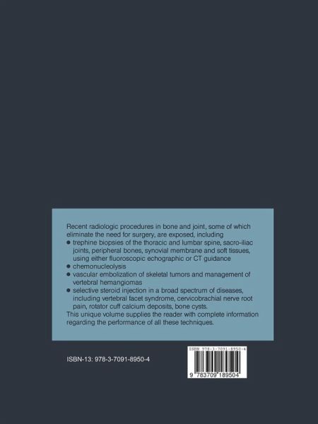 Recent radiologic procedures in bone and joints, some of which eliminate the need for surgery are exposed, including: trephine biopsies of the thoracic and lumbar spine, sacro-iliac joints, peripheral bones synovial membrane and soft tissues, using either fluoroscopic echographic or CT guidance - chemonucleolysis - vascular embolization of skeletal tumors and management of vertebral hemangiomas - selective steroid injection in a broad spectrum of diseases including vertebral facet syndrom, cervicobrachial nerve root pain, rotator cuff calcium deposits, bone cysts. This unique volume supplies the reader with complete information regarding the performance of all these techniques.