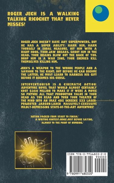 "Roger Jech is a walking talking ricochet that never misses!" Roger Jech doesn't have any superpowers, but he has a super ability: harm him, harm yourself in equal measure. Hit him with a right hook, your jaw breaks. Shoot him in the head, your brains blow out the back of you. Drop him in a war zone, your enemies kill themselves killing him. Jech's a weapon to the wrong people and a savior to the right, but before he can become the latter, he must learn to harness his gift before it becomes his curse. Interventionism is a cinematic action/adventure novel that would almost certainly cost $350 million to make if it were a movie so picture all that production value in your head as you read and turn your theater of the mind into an IMAX 4DX ScreenX XXX Laser-Projected Jargon-Laden Massively-Excessively Mildly-Depressing State-of-the-art adventure! "Action packed from start to finish..." 'A Writing Contest Judge Just Before Saying, "...Almost to the point of numbing."