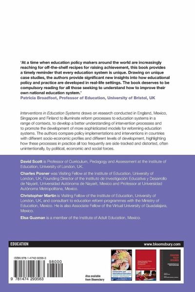 Interventions in Education Systems draws on research conducted in England, Mexico, Singapore and Finland to illuminate reform processes to education systems in a range of contexts, to develop a better understanding of intervention processes and to promote the development of more sophisticated models for reforming education systems. The authors compare policy implementations and interventions in countries with different socio-economic profiles and different levels of development, highlighting how these processes in practice all too frequently are side-tracked and distorted, often unintentionally, by political, economic and social forces.