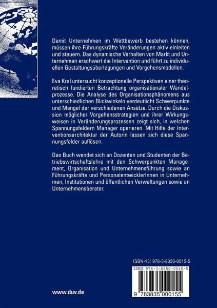 Eva Kral untersucht konzeptionelle Perspektiven einer theoretisch fundierten Betrachtung organisationaler Wandelprozesse. Die Analyse des Organisationsphänomens aus unterschiedlichen Blickwinkeln verdeutlicht Schwerpunkte und Mängel der verschiedenen Ansätze. Durch die Diskussion möglicher Vorgehensstrategien und ihrer Wirkungsweisen in Veränderungsprozessen zeigt sich, in welchen Spannungsfeldern Manager operieren. Mit Hilfe der Interventionsarchitektur der Autorin lassen sich diese Spannungsfelder auflösen.