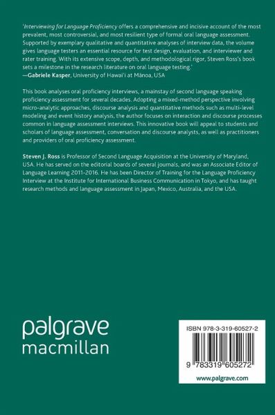 This book analyses oral proficiency interviews, a mainstay of second language speaking proficiency assessment for several decades. Adopting a mixed-method perspective involving micro-analytic approaches, discourse analysis and quantitative methods such as multi-level modeling and event history analysis, the author focuses on interaction and discourse processes common in language assessment interviews. This innovative book will appeal to students and scholars of language assessment, conversation and discourse analysts, as well as practitioners and providers of oral proficiency assessment.