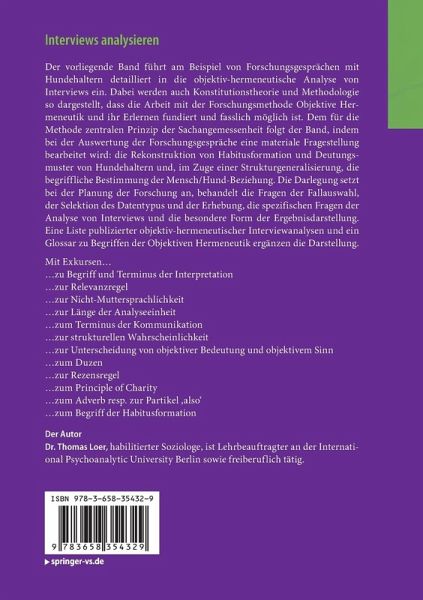 Der vorliegende Band führt am Beispiel von Forschungsgesprächen mit Hundehaltern detailliert in die objektiv-hermeneutische Analyse von Interviews ein. Dabei werden auch Konstitutionstheorie und Methodologie so dargestellt, dass die Arbeit mit der Forschungsmethode Objektive Hermeneutik und ihr Erlernen fundiert und fasslich möglich ist. Dem für die Methode zentralen Prinzip der Sachangemessenheit folgt der Band, indem bei der Auswertung der Forschungsgespräche eine materiale Fragestellung bearbeitet wird: die Rekonstruktion von Habitusformation und Deutungsmuster von Hundehaltern und, im Zuge einer Strukturgeneralisierung, die begriffliche Bestimmung der Mensch/Hund-Beziehung. Die Darlegung setzt bei der Planung der Forschung an, behandelt die Fragen der Fallauswahl, der Selektion des Datentypus und der Erhebung, die spezifischen Fragen der Analyse von Interviews und die besondere Form der Ergebnisdarstellung. EineListe publizierter objektiv-hermeneutischer Interviewanalysen undein Glossar zu Begriffen der Objektiven Hermeneutik ergänzen die Darstellung.