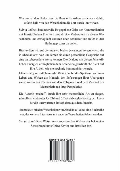 Abadiânia ist einer der magischsten, kraftvollsten Orte auf diesem Planeten. Er hat das Geschenk erhalten, Seelen und Wesenheiten zu einer direkten Kommunikation mit den Menschen zu verhelfen. Seit Jahrzehnten heilen und wirken dort unterschiedliche Seelenkräfte durch das Medium Joao de Deos. Millionen Menschen haben diese Kommunikation bereits erfahren und vielen von ihnen ist Heilung geschenkt geworden. Sylvia Leifheit wurde in Abadiânia bei einer dieser Sessions durch Joao mitgeteilt, dass sie eine Gabe erhalten wird. Diese Gabe der Psychographie entfaltete sich daraufhin nach und nach in ihr. So wurde sie selbst ein vermittelnder Kanal für die Wesenheiten von Abadiânia. Mit Interviews mit den Wesenheiten in Abadjania startet Sylvia Leifheit ihre Buchreihe INTERVIEWS. Ihre Fähigkeit der Kommunikation mit unterschiedlichen feinstofflichen Energien wird so den Menschen zugänglich gemacht. In Interviews mit den Wesenheiten in Abadjania treffen wir auf die meisten bisher bekannten Wesenheiten, die dort wirken und lernen sie durch persönliche Gespräche auf eine ganz besondere Weise kennen. Außerdem schenken uns die Dialoge mit diesen feinstofflichen Energien eine ganzheitliche Sicht auf ihre Arbeit an diesem besonderen Ort. Dabei vermitteln uns die Wesen ein breites Spektrum an Erfahrungen, die sie sowohl zu ihren Lebzeiten als auch bei ihren Übergängen in die anderen Bewusstseinszustände gemacht haben. Auch zu Themen wie Religionen oder dem Zustand der Menschheit geben sie uns persönlich perspektivische Einblicke. Sylvia Leifheits unvergleichliche Art, sehr menschlich zu fragen, macht es dem Leser leicht, sich vertrauensvoll für die unerwarteten Botschaften aus dem Jenseits zu öffnen. Wer bereit ist, kommt hierdurch nicht nur in Kontakt mit seiner Seele, sondern lernt auch, diese zu heilen. Egal an welchem Ort dieser Erde.