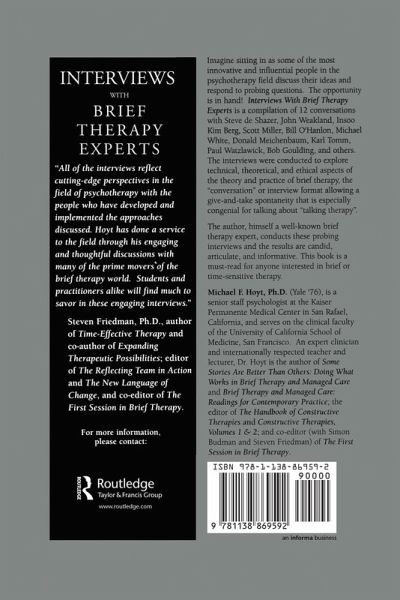 This book is a compilation of twelve interviews with brief therapy experts and some of the field's most influential innovators (O'Hanlon, de Shazer, White, and Meichenbaum to name a few). The interviews, conducted to explore technical, theoretical, and ethical aspects of the theory and practice of brief therapy, offer the give-and-take spontaneity that can only be found in an interview style. The selection of the content is based on both the expertise of the interviewees as well as those issues of most concern to the field: managed care and economics, ethics, and being solution-focused.
