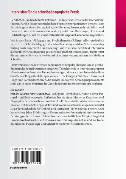 Vorwort.- 1. Einleitung.- 2. Schreibpädagogische Praxis.- 3. Intervision.- 4. Methoden für die Reflexion.- 5. Entwicklung eines Schreibgruppenkonzepts für die Kollegiale Beratung.- 6. Implementierung des Konzepts: Sechs initiale Schreibgruppensitzungen.- 7. Das Intervisionssetting für die schreibpädagogische Praxis: Zusammenfassung, Reflexion und Ausblick.- 8. Anhang.