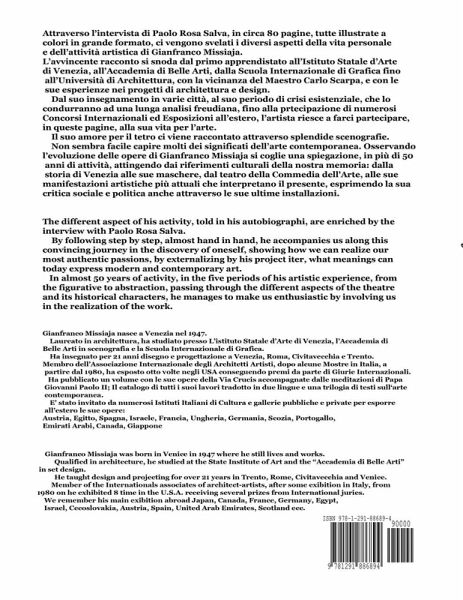 Attraverso l'intervista di Paolo Rosa Salva, in più di 80 pagine, tutte illustrate a colori in grande formato, ci vengono svelati i diversi aspetti della vita personale e dell'attività artistica di Gianfranco Missiaja. L'avvincente racconto si snoda dall'apprendistato all'Istituto Statale d'Arte, all'Accademia di Belle Arti, alla Scuola Internazionale di Grafica fino all'Università di Architettura, con il Maestro Carlo Scarpa e con le sue esperienze progettuali. Dal suo insegnamento in varie città, fino alla prtecipazione di numerosi Concorsi Internazionali ed Esposizioni all'estero, l'artista ci fa partecipare al suo "teatro" attraverso splendide scenografie. Non sembra facile capire molti dei significati dell'arte contemporanea. Osservando l'evoluzione si coglie una spiegazione, in più di 50 anni di attività, attingendo dai riferimenti culturali della nostra memoria: dalla storia di Venezia alla Commedia dell'Arte, fino alle sue manifestazioni artistiche più attuali che interpretano il presente