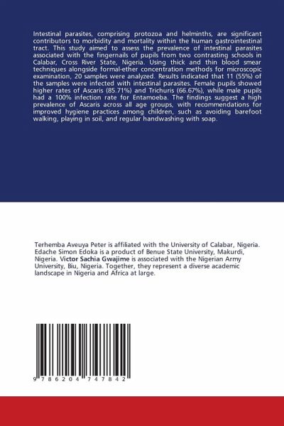 Intestinal parasites, comprising protozoa and helminths, are significant contributors to morbidity and mortality within the human gastrointestinal tract. This study aimed to assess the prevalence of intestinal parasites associated with the fingernails of pupils from two contrasting schools in Calabar, Cross River State, Nigeria. Using thick and thin blood smear techniques alongside formal-ether concentration methods for microscopic examination, 20 samples were analyzed. Results indicated that 11 (55%) of the samples were infected with intestinal parasites. Female pupils showed higher rates of Ascaris (85.71%) and Trichuris (66.67%), while male pupils had a 100% infection rate for Entamoeba. The findings suggest a high prevalence of Ascaris across all age groups, with recommendations for improved hygiene practices among children, such as avoiding barefoot walking, playing in soil, and regular handwashing with soap.