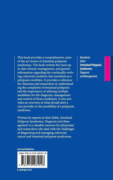 This book provides a comprehensive, state-of-the art review of intestinal polyposis syndromes. The book reviews the most up-to-date clinical, management, and genetic information regarding the continually evolving colorectal condition that manifests as a polyposis condition. It provides a reference for clinicians and researchers in understanding the complexity of intestinal polyposis and the importance of utilizing multiple modalities for the diagnosis, management and control of these conditions. It also provides an overview of what should alert a care provider to the possibility of a polyposis syndrome.