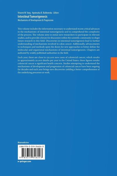 1 Hereditary CRC syndrome.-2 Microsatellite Instability and Intestinal Tumorigenesis.-3 Biology of Intestinal Epithelial Stem Cells.-4 The role of PI3K Signaling Pathway in Intestinal Tumorigenesis.-5 The Epigenetics in Intestinal Tumorigenesis.-6 MicroRNA involvement in Intestinal Tumorigenesis.-7 Microbiome implications in Intestinal Tumorigenesis.-8 Inflammation and Colorectal Cancer.-9 Sphingolipids in Intestinal Inflammation and Tumorigenesis.-10 Aging: an Etiological factor in the Development of Intestinal Tumorigenesis.-11 Epithelial to Mesenchymal Transition [EMT] and Intestinal Tumorigenesis.-12 Omics and biomarkers development for Intestinal Tumorigenesis.-13 Targeted Therapies towards Intestinal Tumorigenesis.