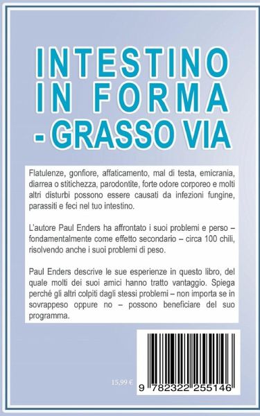 Flatulenze, gonfiore, affaticamento, mal di testa, emicrania, diarrea o stitichezza, parodontite, forte odore corporeo e molti altri disturbi possono essere causati da infezioni fungine, parassiti e feci nel tuo intestino. L'autore Paul Enders ha affrontato i suoi problemi e perso - fondamentalmente come effetto secondario - circa 100 chili, risolvendo anche i suoi problemi di peso. Paul Enders descrive le sue esperienze in questo libro, del quale molti dei suoi amici hanno tratto vantaggio. Spiega perché gli altri colpiti dagli stessi problemi - non importa se in sovrappeso oppure no - possono beneficiare del suo programma.