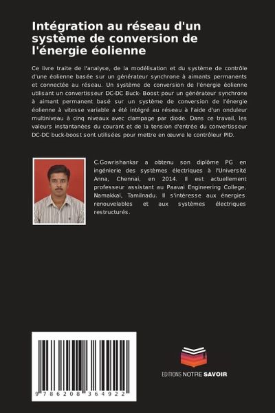 Ce livre traite de l'analyse, de la modélisation et du système de contrôle d'une éolienne basée sur un générateur synchrone à aimants permanents et connectée au réseau. Un système de conversion de l'énergie éolienne utilisant un convertisseur DC-DC Buck- Boost pour un générateur synchrone à aimant permanent basé sur un système de conversion de l'énergie éolienne à vitesse variable a été intégré au réseau à l'aide d'un onduleur multiniveau à cinq niveaux avec clampage par diode. Dans ce travail, les valeurs instantanées du courant et de la tension d'entrée du convertisseur DC-DC buck-boost sont utilisées pour mettre en oeuvre le contrôleur PID.