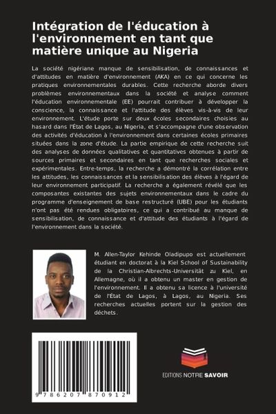 La société nigériane manque de sensibilisation, de connaissances et d'attitudes en matière d'environnement (AKA) en ce qui concerne les pratiques environnementales durables. Cette recherche aborde divers problèmes environnementaux dans la société et analyse comment l'éducation environnementale (EE) pourrait contribuer à développer la conscience, la connaissance et l'attitude des élèves vis-à-vis de leur environnement. L'étude porte sur deux écoles secondaires choisies au hasard dans l'État de Lagos, au Nigeria, et s'accompagne d'une observation des activités d'éducation à l'environnement dans certaines écoles primaires situées dans la zone d'étude. La partie empirique de cette recherche suit des analyses de données qualitatives et quantitatives obtenues à partir de sources primaires et secondaires en tant que recherches sociales et expérimentales. Entre-temps, la recherche a démontré la corrélation entre les attitudes, les connaissances et la sensibilisation des élèves à l'égard de leur environnement participatif. La recherche a également révélé que les composantes existantes des sujets environnementaux dans le cadre du programme d'enseignement de base restructuré (UBE) pour les étudiants n'ont pas été rendues obligatoires, ce qui a contribué au manque de sensibilisation, de connaissance et d'attitude des étudiants à l'égard de l'environnement dans la société.