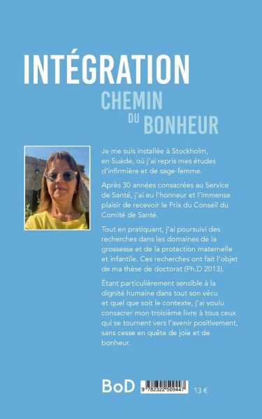 Je me suis installée à Stockholm, en Suède, où j'ai repris mes études d'infirmière et de sage-femme. Après 30 années consacrées au Service de Santé, j'ai eu l'honneur et l'immense plaisir de recevoir le Prix du Conseil du Comité de Santé. Tout en pratiquant, j'ai poursuivi des recherches dans les domaines de la grossesse et de la protection maternelle et infantile. Ces recherches ont fait l'objet de ma thèse de doctorat. (Ph.D 2013). Étant particulièrement sensible à la dignité humaine dans tout son vécu et quel que soit le contexte, j'ai voulu consacrer mon troisième livre à tous ceux qui se tournent vers l'avenir positivement, sans cesse en quête de joie et de bonheur.