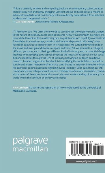 Intimacy and Friendship on Facebook theorises the impact of Facebook on our social lives through the lens of intimacy. Lambert constructs an original understanding of why people welcome public intimacy on Facebook and how they attempt to control it, asking the reader to re-imagine what it means to be intimate online.