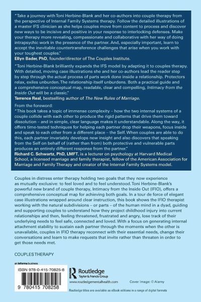 "Take a journey with Toni Herbine-Blank and her co-authors into couple therapy from the perspective of Internal Family Systems therapy. Follow the detailed illustrations of a master IFS clinician as she helps couples move from content to process and discover new ways to be incisive and positive in your response to interlocking defenses. Make your therapy more revealing, compassionate and collaborative with her way of doing intrapsychic work in the presence of the partner. And, especially important, learn to accept the inevitable countertransference challenges that arise when you work with your toughest couples." Ellyn Bader, PhD, founder/director of The Couples Institute.