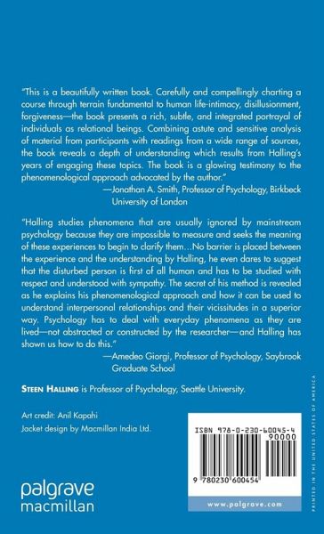 "This is a beautifully written book. Carefully and compellingly charting a course through terrain fundamental to human life-intimacy, disillusionment, forgiveness-the book presents a rich, subtle, and integrated portrayal of individuals as relational beings. Combining astute and sensitive analysis of material from participants with readings from a wide range of sources, the book reveals a depth of understanding which results from Halling s years of engaging these topics. The book is a glowing testimony to the phenomenological approach advocated by the author." - Jonathan A. Smith, Professor of Psychology, Birkbeck College, University of London
