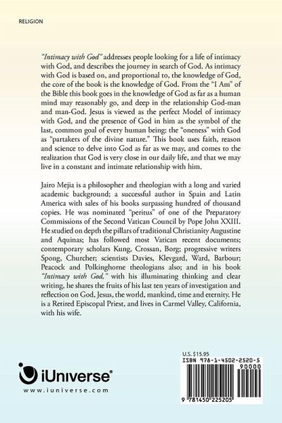 "Intimacy with God" addresses people looking for a life of intimacy with God, and describes the journey in search of God; intimacy with God is based on, and proportional to, the knowledge of God. The book sees Jesus as the Model of a perfect intimacy with God; and his 'divinization' as the symbol of the last, common goal of every human being: "oneness" with God. This book uses faith, reason and science to delve into God as far as we may, and comes to the realization that God is very close in our daily life, and that we may live in a constant and intimate relationship with him.