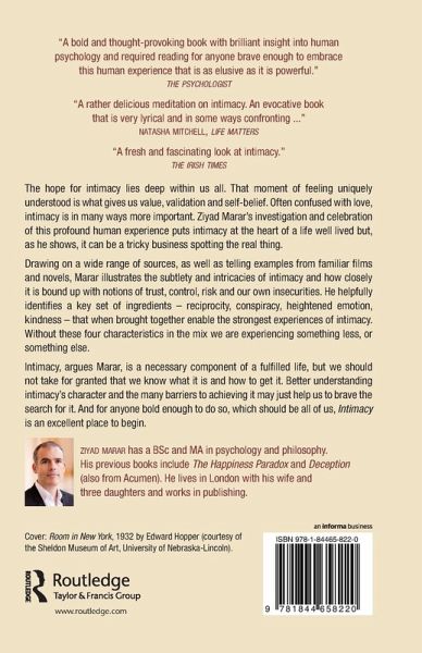 The hope for intimacy lies deep within us all. That moment of feeling uniquely understood, the antidote to isolation, is what gives us value, validation and self-belief. But as Ziyad Marar shows in this fascinating and engaging study, intimacy is a tricky business. The prevalence of social media, for example, is a sign of our desire for human connection, yet is a symptom of how little we truly achieve it. Often confused with love, intimacy is in many ways more important. Marar's investigation and celebration of this elusive but profound human experience shows how intimacy is central to a life well lived. But how do we spot the real thing? Marar helpfully identifies a key set of ingredients - reciprocity, conspiracy, heightened emotion, kindness - that when brought together enable the strongest experiences of intimacy. Without these four characteristics in the mix we are experiencing something less, or something else. Drawing on a wide range of sources - from key thinkers, as well as telling examples from familiar films and novels - Marar illustrates the subtlety and intricacies of intimacy and shows how closely it is bound up with notions of trust, control, risk and our own insecurities. Intimacy, argues Marar, is a necessary component of a fulfilled life. Yet we should not take for granted that we know what it is and how to get it. A better understanding of this powerful experience and the many barriers to achieving it may just help us to brave the search for it. For anyone bold enough to do so, which should be all of us, Intimacy is required reading.