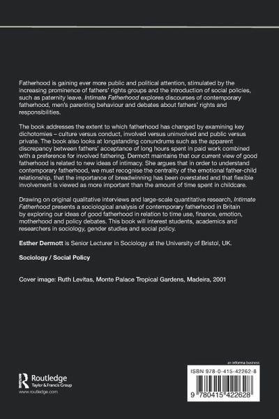 Fatherhood is gaining ever more public and political attention, stimulated by the increasing prominence of fathers' rights groups and the introduction of social policies, such as paternity leave. Intimate Fatherhood explores discourses of contemporary fatherhood, men's parenting behaviour and debates about fathers' rights and responsibilities. The book addresses the extent to which fatherhood has changed by examining key dichotomies - culture versus conduct, involved versus uninvolved and public versus private. The book also looks at longstanding conundrums such as the apparent discrepancy between fathers' acceptance of long hours spent in paid work combined with a preference for involved fathering. Dermott maintains that our current view of good fatherhood is related to new ideas of intimacy. She argues that in order to understand contemporary fatherhood, we must recognise the centrality of the emotional father-child relationship, that the importance of breadwinning has been overstated and that flexible involvement is viewed as more important than the amount of time spent in childcare. Drawing on original qualitative interviews and large-scale quantitative research, Intimate Fatherhood presents a sociological analysis of contemporary fatherhood in Britain by exploring our ideas of good fatherhood in relation to time use, finance, emotion, motherhood and policy debates. This book will interest students, academics and researchers in sociology, gender studies and social policy.