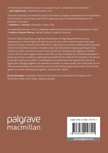 This book takes the globally recognised phenomenon of drag king performances as an opportunity for critical inquiry into the rise and fall of an urban scene for lesbian and queer women in Sydney, Australia (circa 1999-2012). Exploring how a series of weekly events provided the site for intimate encounters, Drysdale reveals the investments made by participants that worked to sustain the sense of a small world and anchor the expansive imaginary of lesbian cultural life. But what happens when scenes fade, as they invariably do? Intimate Investments in Drag King Cultures is unique in capturing the perspective of a scene at the moment of its decline, revealing the process by which a contemporary movement becomes layered with historical significance. Bringing together the theoretical tradition of scene studies with recent work on the affective potentialities of the everyday and the mobile urban spaces they inhabit, this book has appeal to scholars working across gender, sexuality and culture.