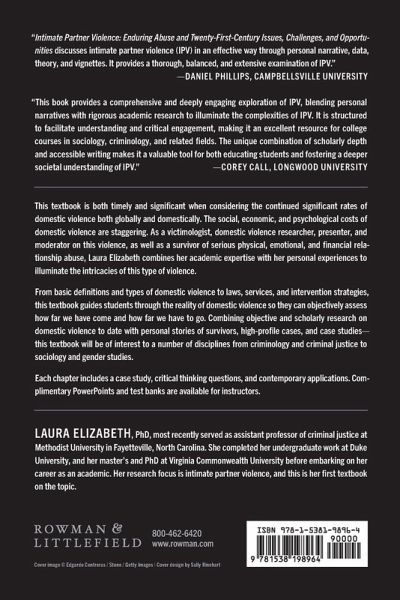 This textbook is both timely and significant when considering the continued significant rates of domestic violence both globally and domestically. The social, economic, and psychological costs of domestic violence are staggering. As a victimologist, domestic violence researcher, presenter, and moderator on this violence, as well as a survivor of serious physical, emotional, and financial relationship abuse, Laura Elizabeth combines her academic expertise with her personal experiences to illuminate the intricacies of this type of violence. From basic definitions and types of domestic violence to laws, services, and intervention strategies, this textbook guides students through the reality of domestic violence so they can objectively assess how far we have come and how far we have to go. Combining objective and scholarly research on domestic violence to date, with personal stories of survivors, high-profile cases, and case studies, this textbook will be of interest to a number of disciplines from criminology and criminal justice to sociology and gender studies.