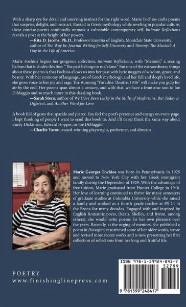 Intimate Reflections is an enticing glimpse into the long life of Marie Fochios, now 98. These poems capture her passion for her Greek heritage, her zest for adventure, and her capacity to perceive the beauty and wisdom in the ordinary. They reflect a highly individualized, candid voice and an assertive spirit that cannot be ignored.