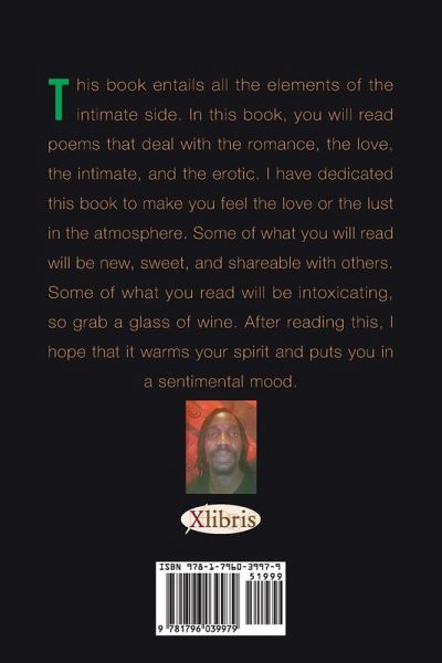 This book entails all the elements of the intimate side. In this book, you will read poems that deal with the romance, the love, the intimate, and the erotic. I have dedicated this book to make you feel the love or the lust in the atmosphere. Some of what you will read will be new, sweet, and shareable with others. Some of what you read will be intoxicating, so grab a glass of wine. After reading this, I hope that it warms your spirit and puts you in a sentimental mood.